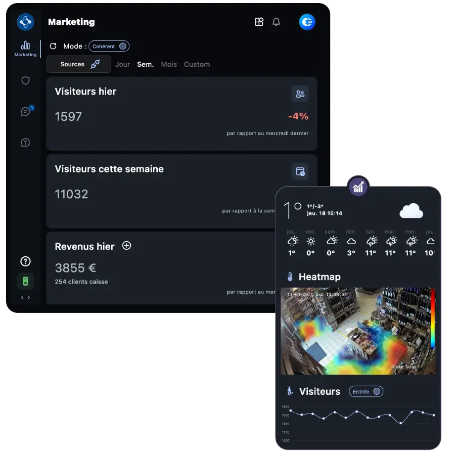 Notre solution ne se limite pas à la sécurité. Grâce au comptage visiteurs, aux cartes de chaleur et à l’analyse de flux, vous obtenez une vision complète de la fréquentation et du comportement client. Ces données permettent d’optimiser les parcours, les zones froides et les horaires de staffing.